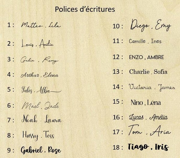 - Indiquez nous lors de votre commande : Le prénom, la date de naissance, la taille, le poids, la mesure et l'heure de naissance.